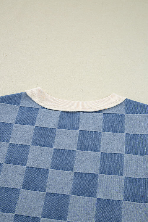 Sky Blue Oversized Checkered Denim Exposed Seam Patchwork Casual Sweatshirt
