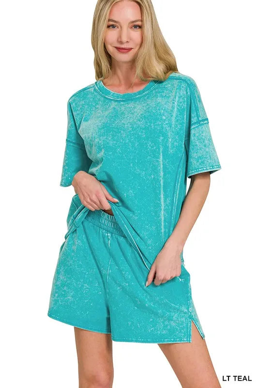 Zenana Acid Washed Short Sleeve Tee & Shorts Set