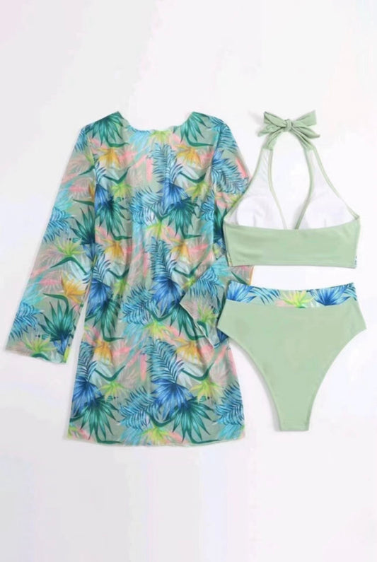 Green Floral Three Piece Top, Bottom , Cover Up Set